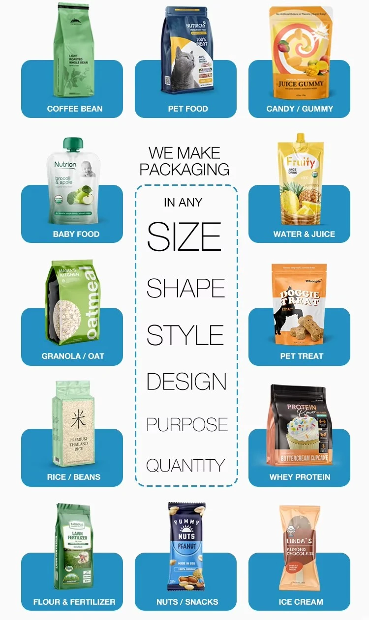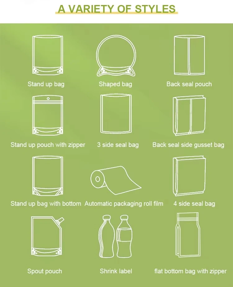 Stand up, three side seal, side gusset, quad seal, back seal, flat bottom, roll film ,spout etc |