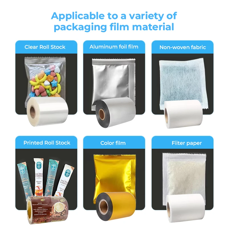 Stand up, three side seal, side gusset, quad seal, back seal, flat bottom, roll film ,spout etc