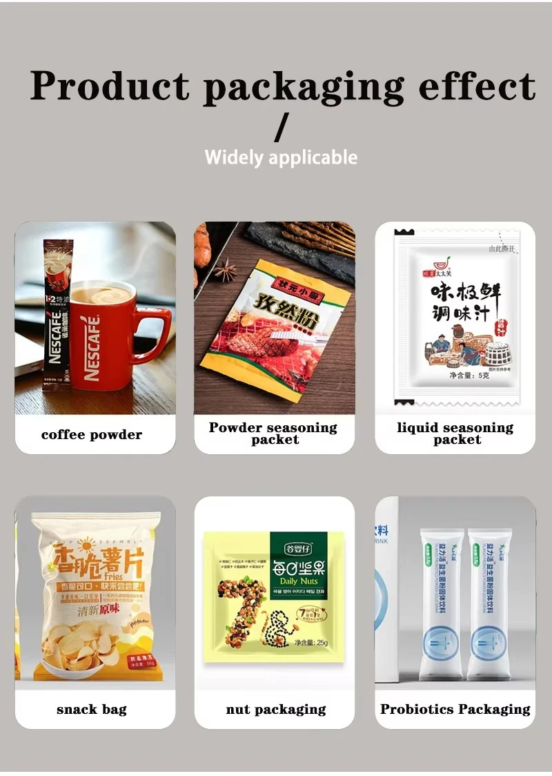 Stand up, three side seal, side gusset, quad seal, back seal, flat bottom, roll film ,spout etc |