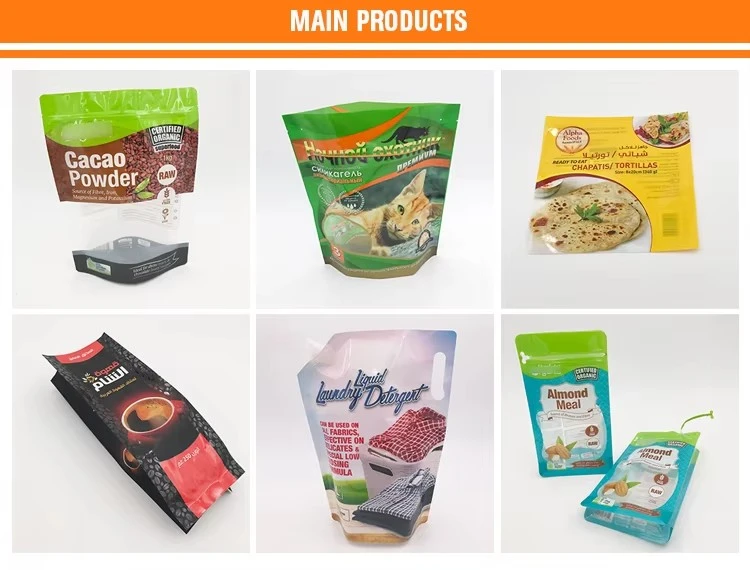 Stand up, three side seal, side gusset, quad seal, back seal, flat bottom, roll film ,spout etc |