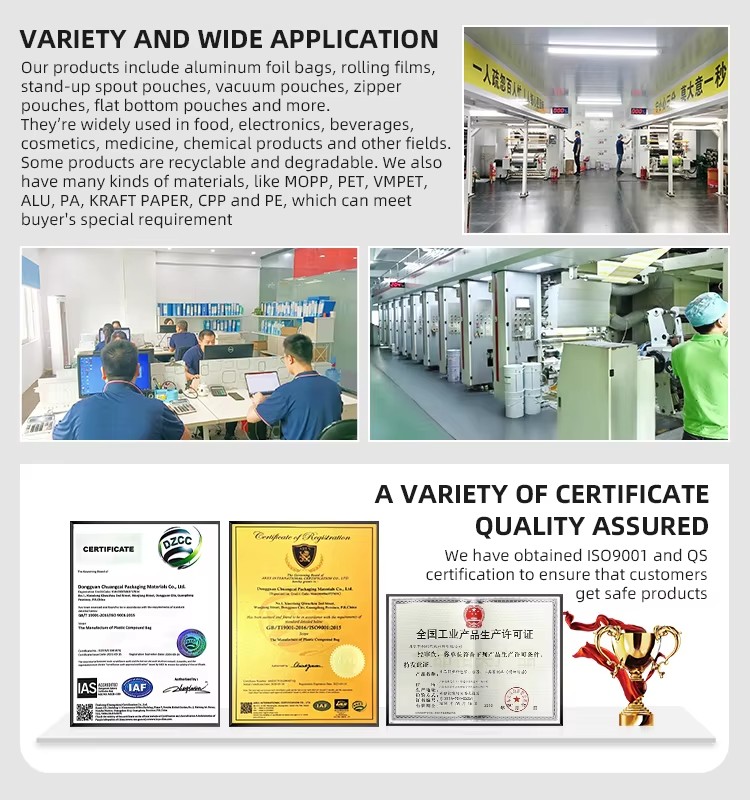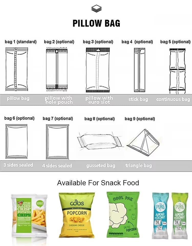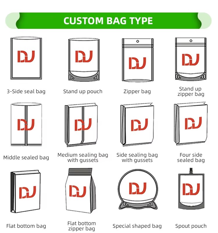 Stand up, three side seal, side gusset, quad seal, back seal, flat bottom, roll film ,spout etc |